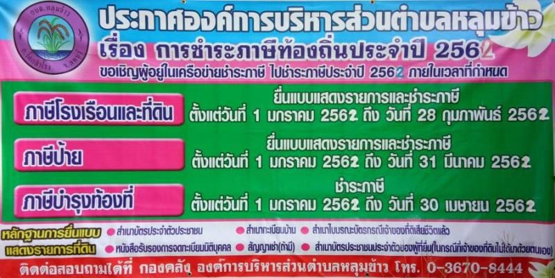 ประชาสัมพันธ์ ประกาศองค์การบริหารส่วนตำบลหลุมข้าว อำเภอโคกสำโรง จังหวัดลพบุรี เรื่องการรับชำระภาษีท้องถิ่นประจำปี พ.ศ.2562 (1 ภาพ)