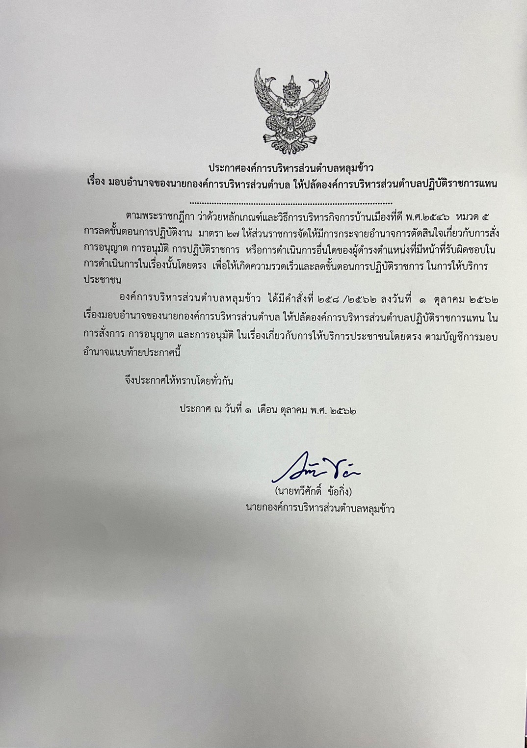 ประกาศมอบอำนาจของนายกองค์การบริหารส่วนตำบล ให้ปลัดองค์การบริหารส่วนตำบลปฏิบัติราชการแทน