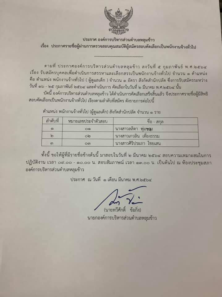 รายละเอียด : ประกาศ องค์การบริหารส่วนตำบลหลุมข้าว เรื่อง ประกาศรายชื่อผู้ผ่านการตรวจสอบคุณสมบัติผู้สมัครสอบคัดเลือกเป็นพนักงานจ้างทั่วไป ตามที่ ประกาศองค์การบริหารส่วนตำบลหลุมข้าว ประกาศ เรื่อง รับสมัครบุคคลเพื่อดำเนินการสรรหาและเลือกสรรเป็นพนักงานจ้างทั่วไป ขององค์การบริหารส่วนตำบลหลุมข้าว อำเภอโคกสำโรง จังหวัดลพบุรี ตำแหน่ง ผู้ดูแลเด็กเล็ก จำนวน 1 อัตรา ได้ดำเนินปิดรับสมัครเป็นที่เรียบร้อยแล้ว จำนวน 3 อัตรา ดังรายชื่อต่อไปนี้