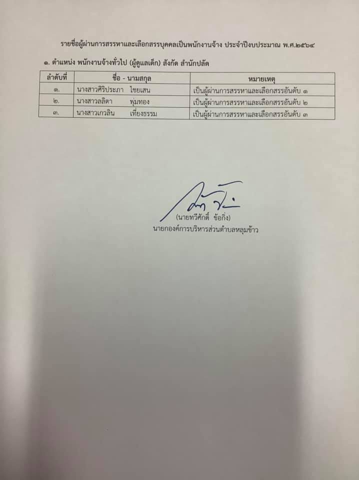 เรื่อง ประกาศผลผู้ผ่านการสรรหาและเลือกสรรบุคคลเป็นพนักงานจ้าง ประจำปีงบประมาณ พ.ศ. 2564 ตำแหน่ง พนักงานจ้างทั่วไป (ผู้ดูแลเด็ก)