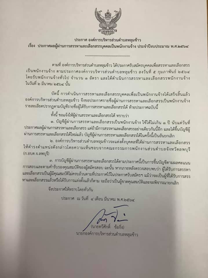 รายละเอียด : ประกาศ องค์การบริหารส่วนตำบลหลุมข้าว