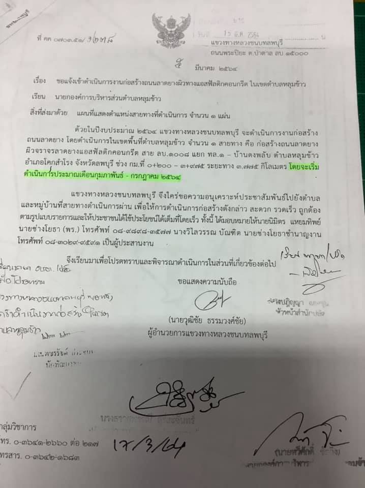 โดยจะเริ่มดำเนินการประมาณเดือนกุมภาพันธ์-กรกฎาคม 2564 สถานที่ก่อสร้างถนนลาดยางผิวจราจรลาดยางแอสฟัลติกคอนกรีต สาย ลบ.1008 แยก ทล.1 - บ้านดงพลับ ตำบลหลุมข้าว อำเภอโคกสำโรง จังหวัดลพบุรี ช่วง กม.ที่ 0+200 -3+975 ระยะทาง 3.775 กิโลเมตร