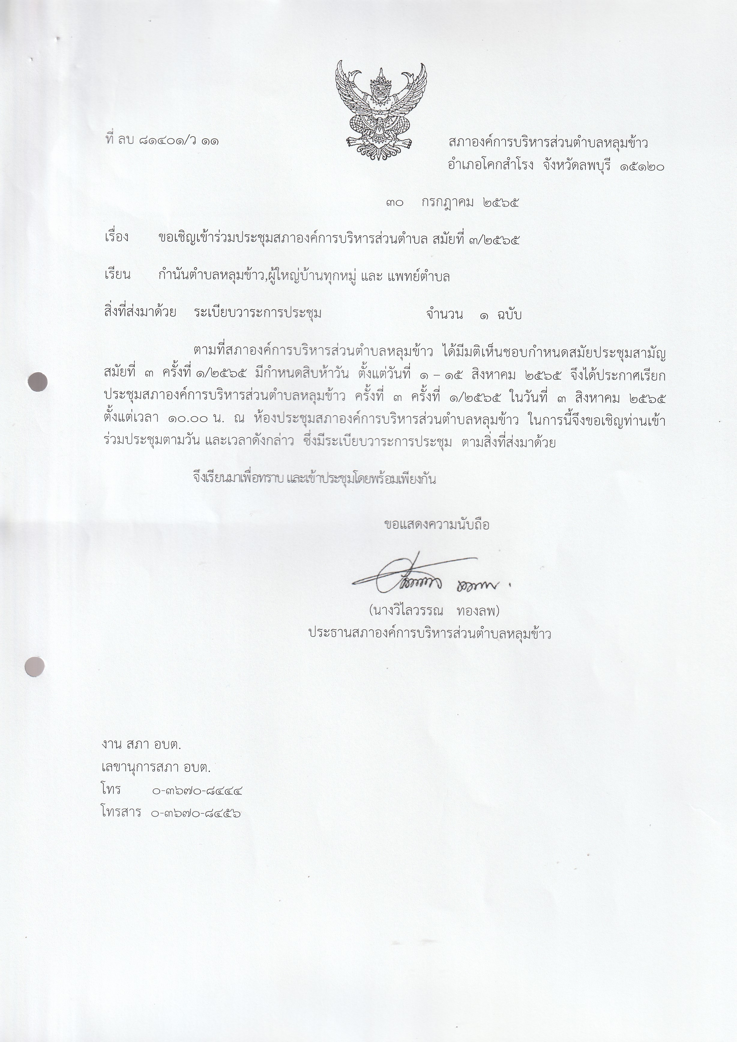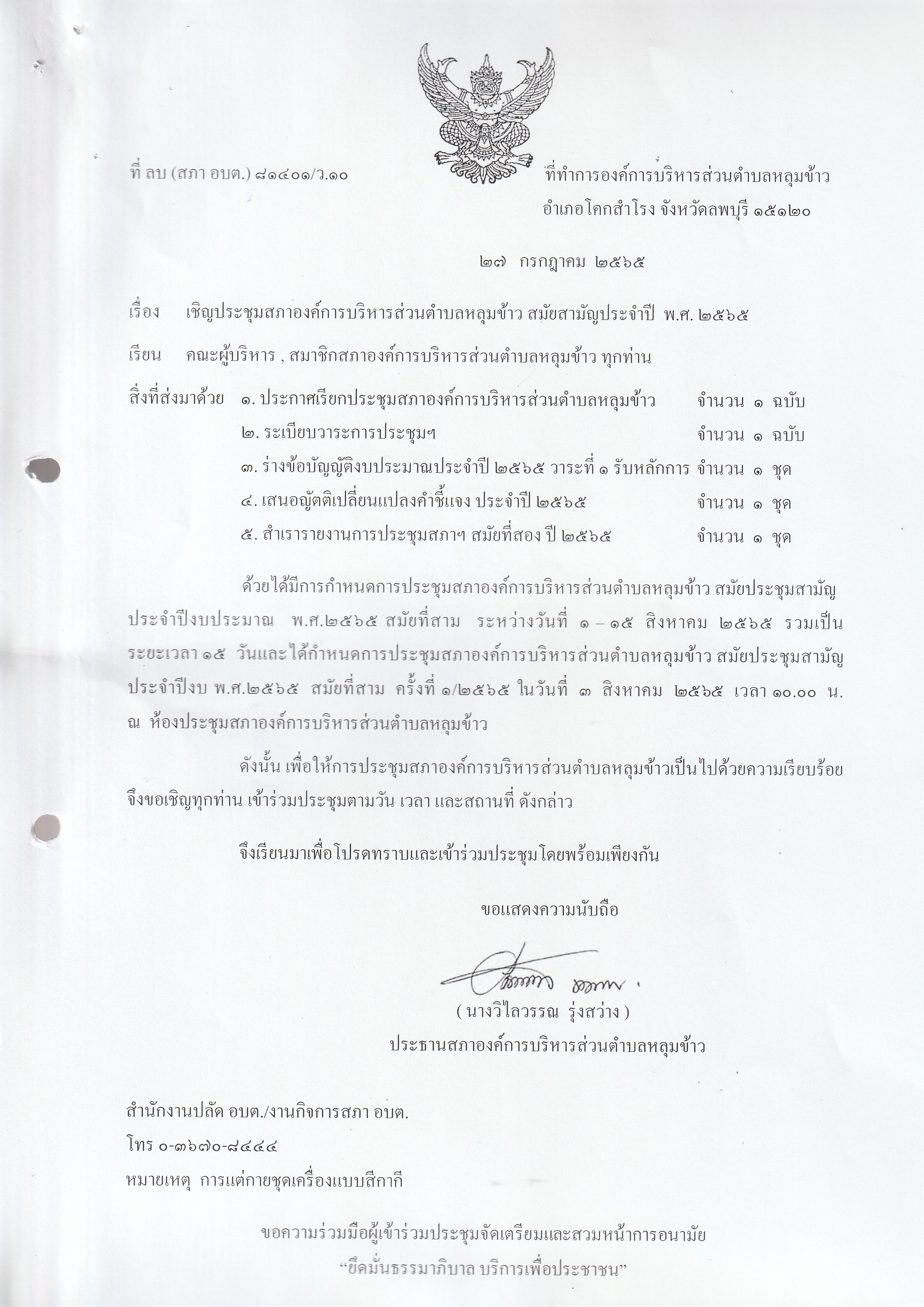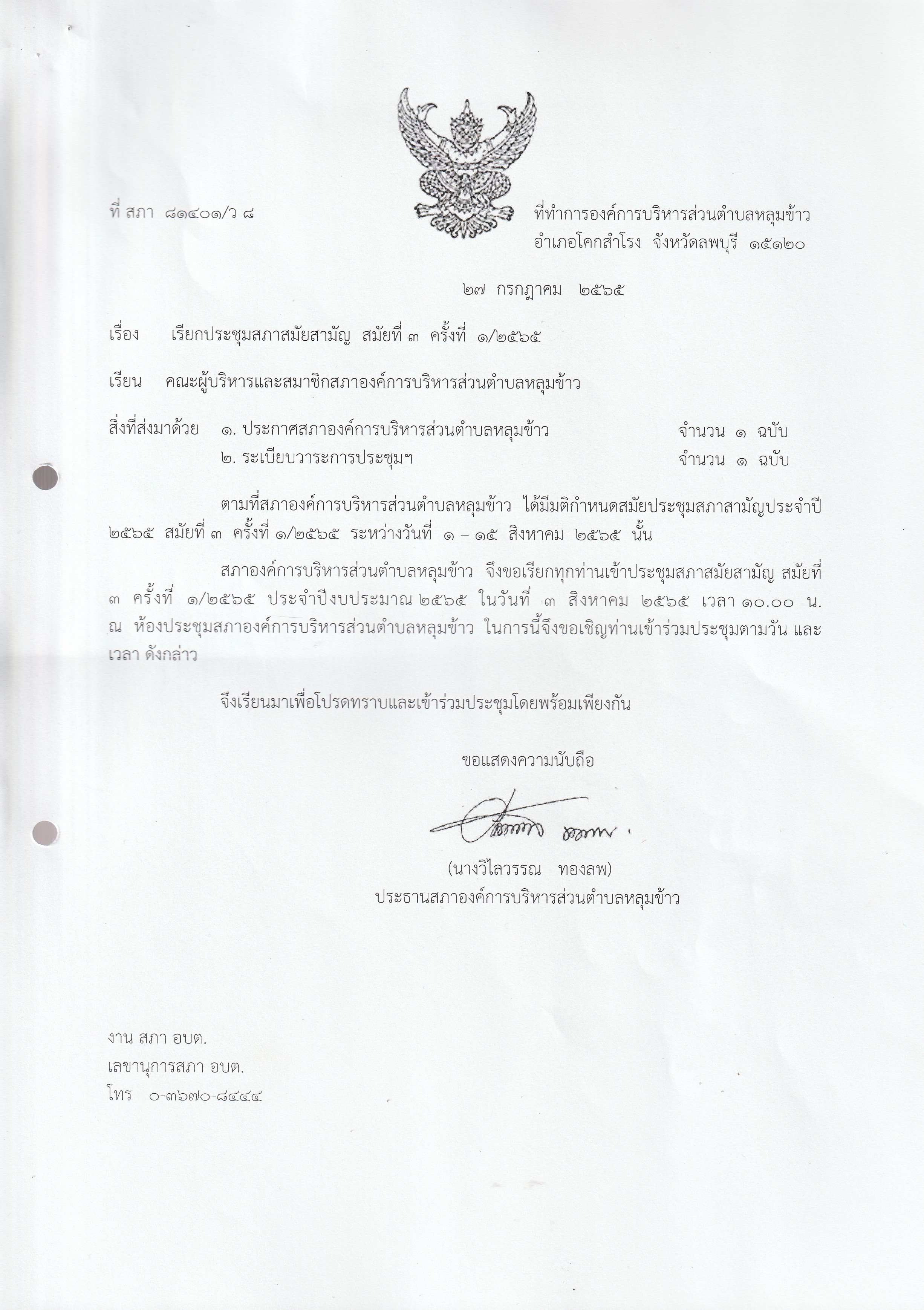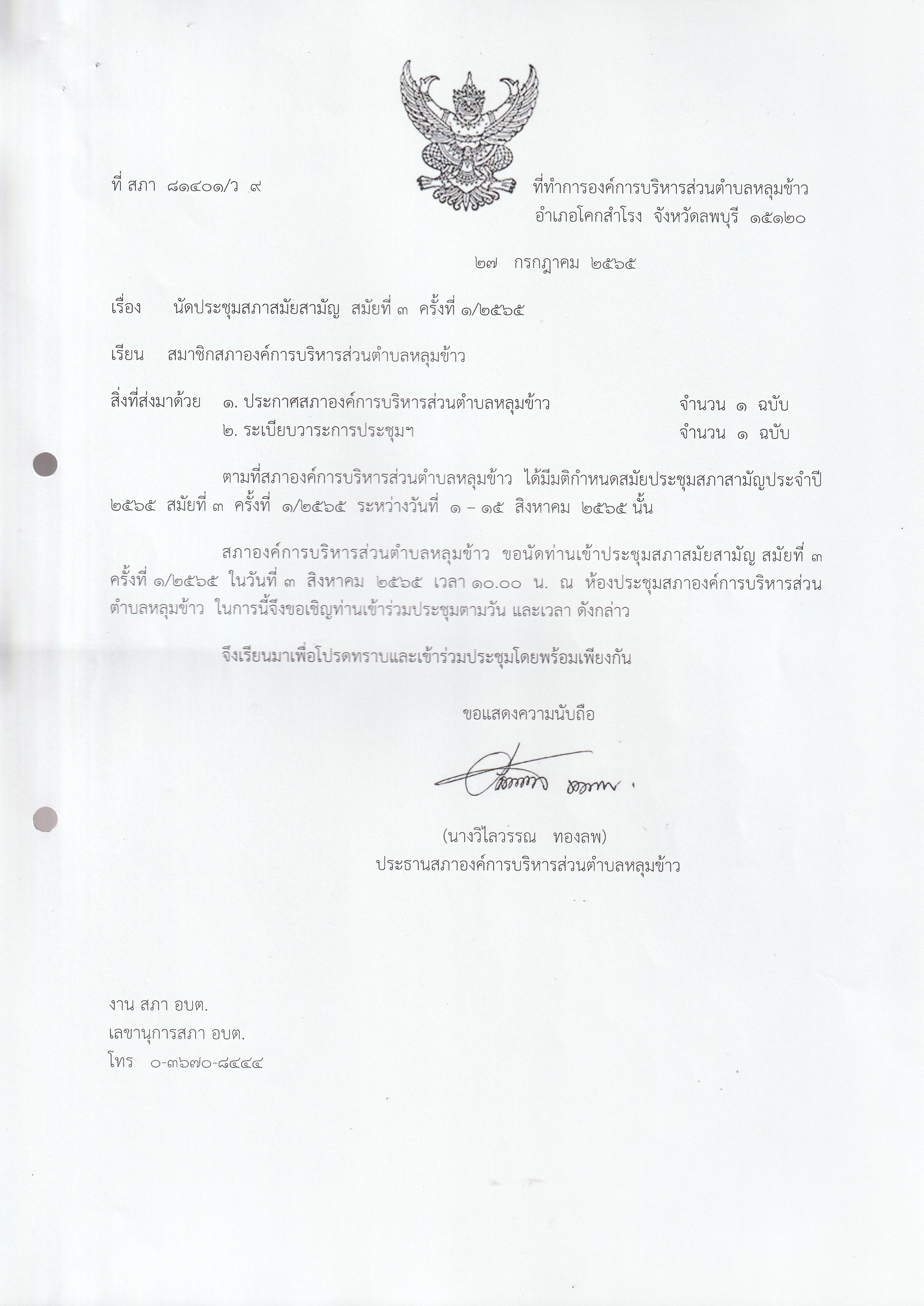 หนังสือเชิญประชุมสภาองค์การบริหารส่วนตำบลหลุมข้าว สมัยที่ 3 ปี 2565 (ครั้งที่ 1)