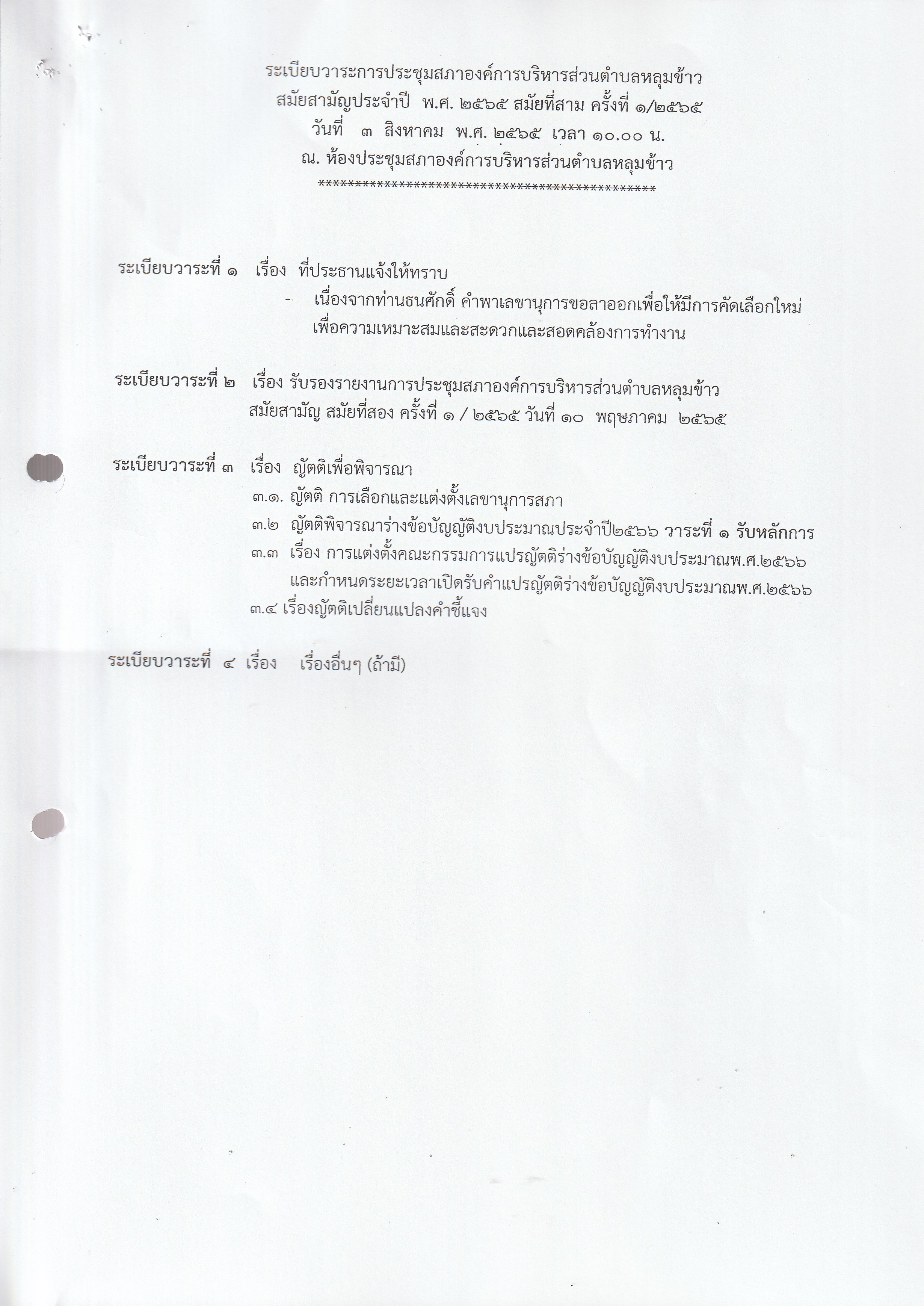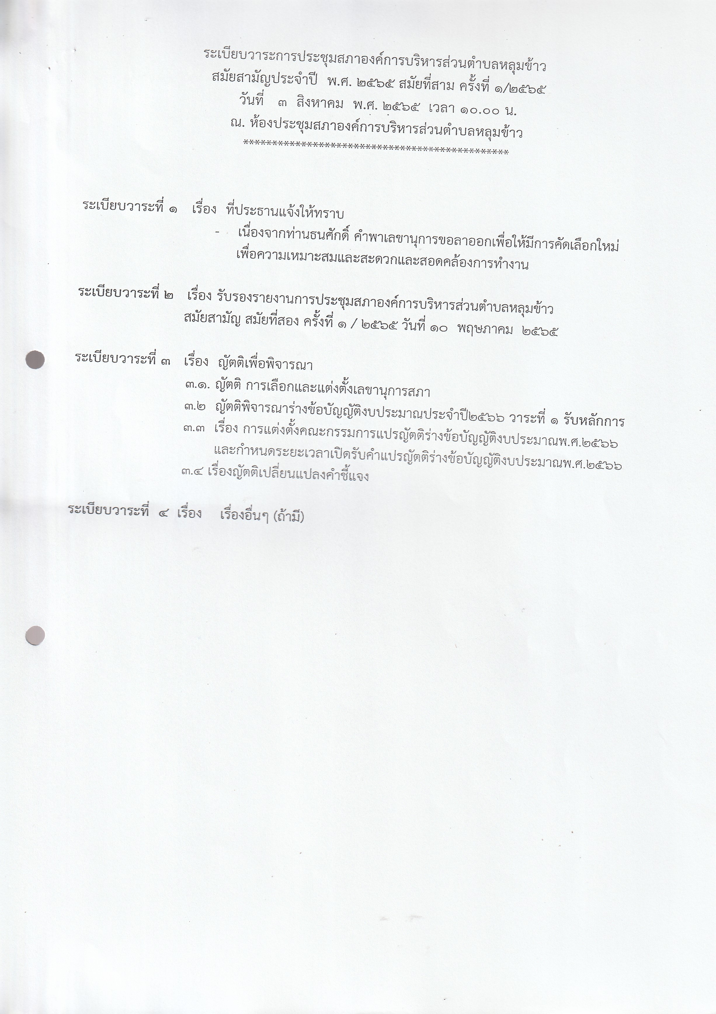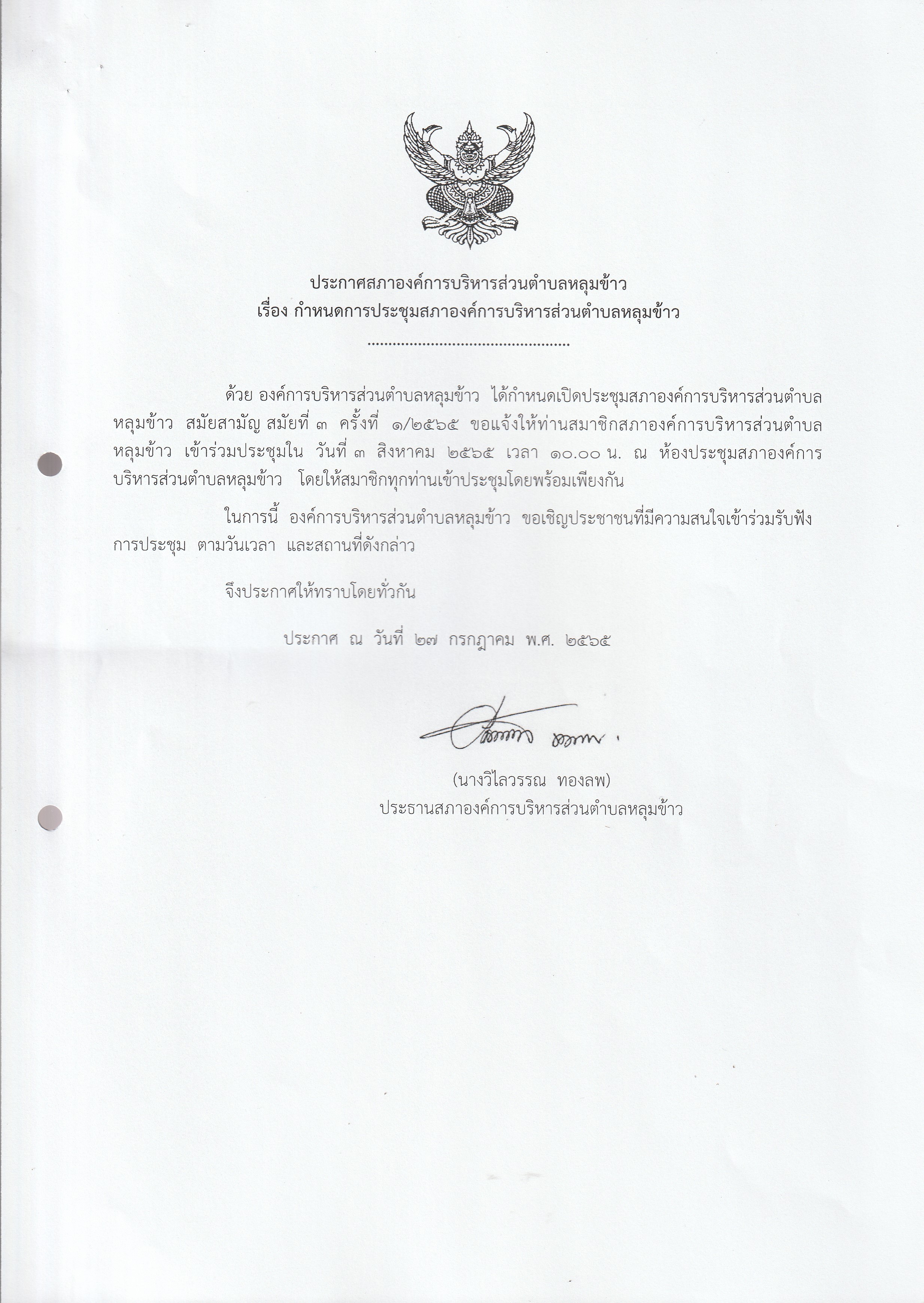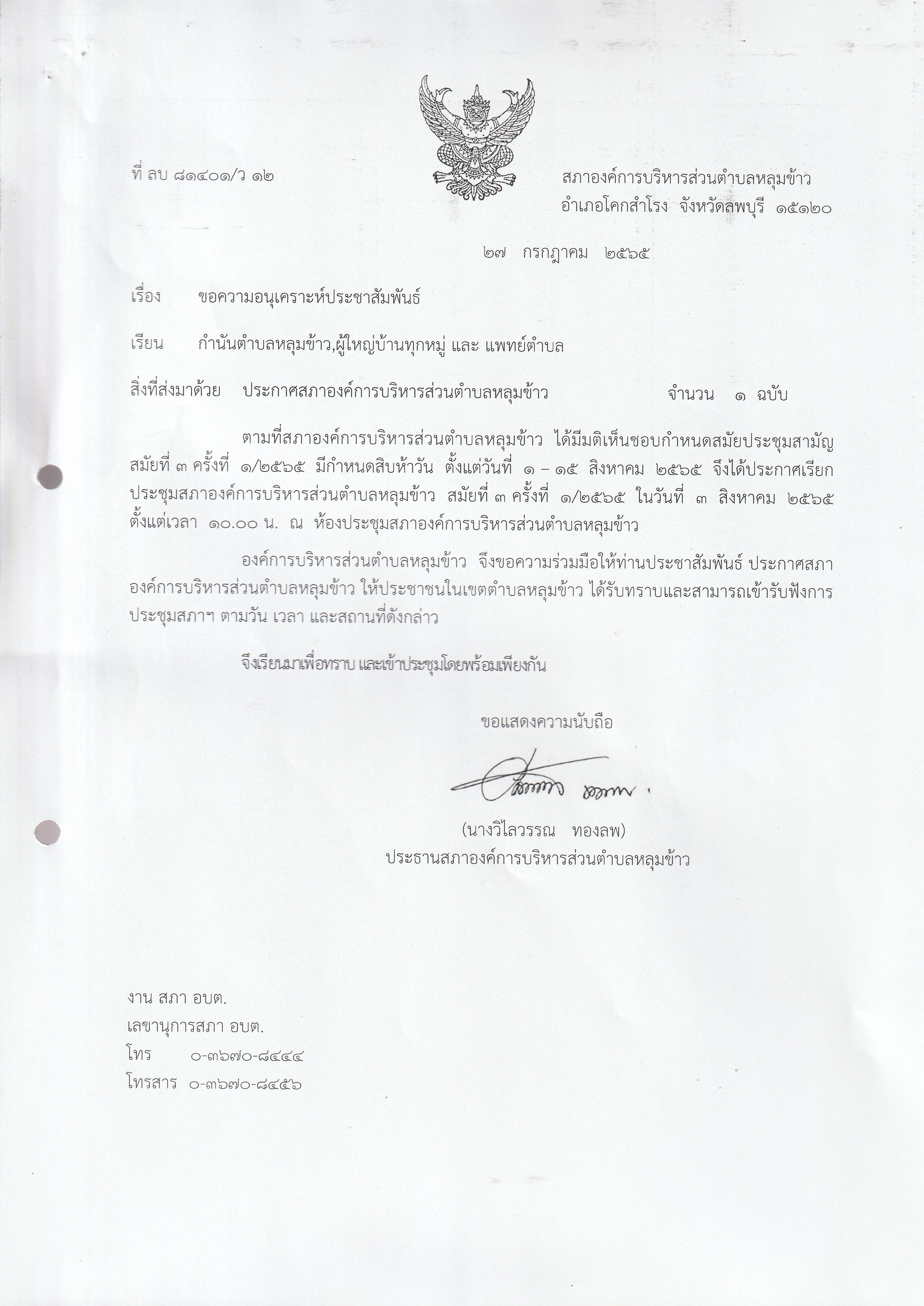 หนังสือเชิญประชุมสภาองค์การบริหารส่วนตำบลหลุมข้าว สมัยที่ 3 ปี 2565 (ครั้งที่ 1)