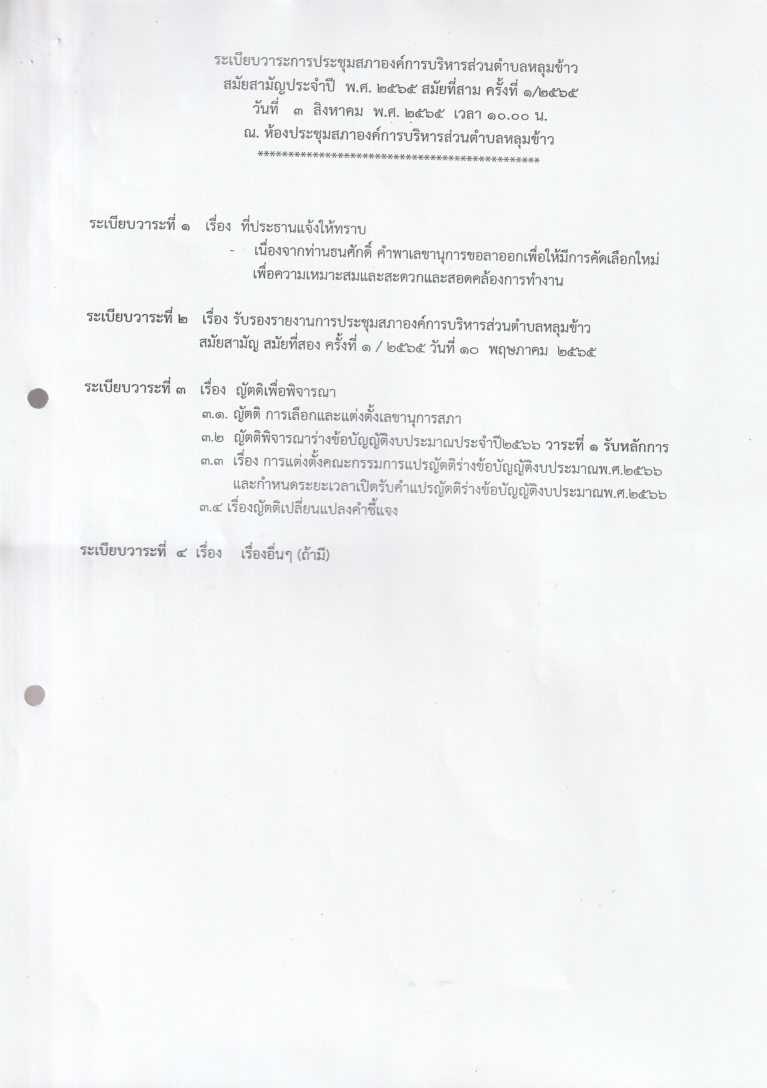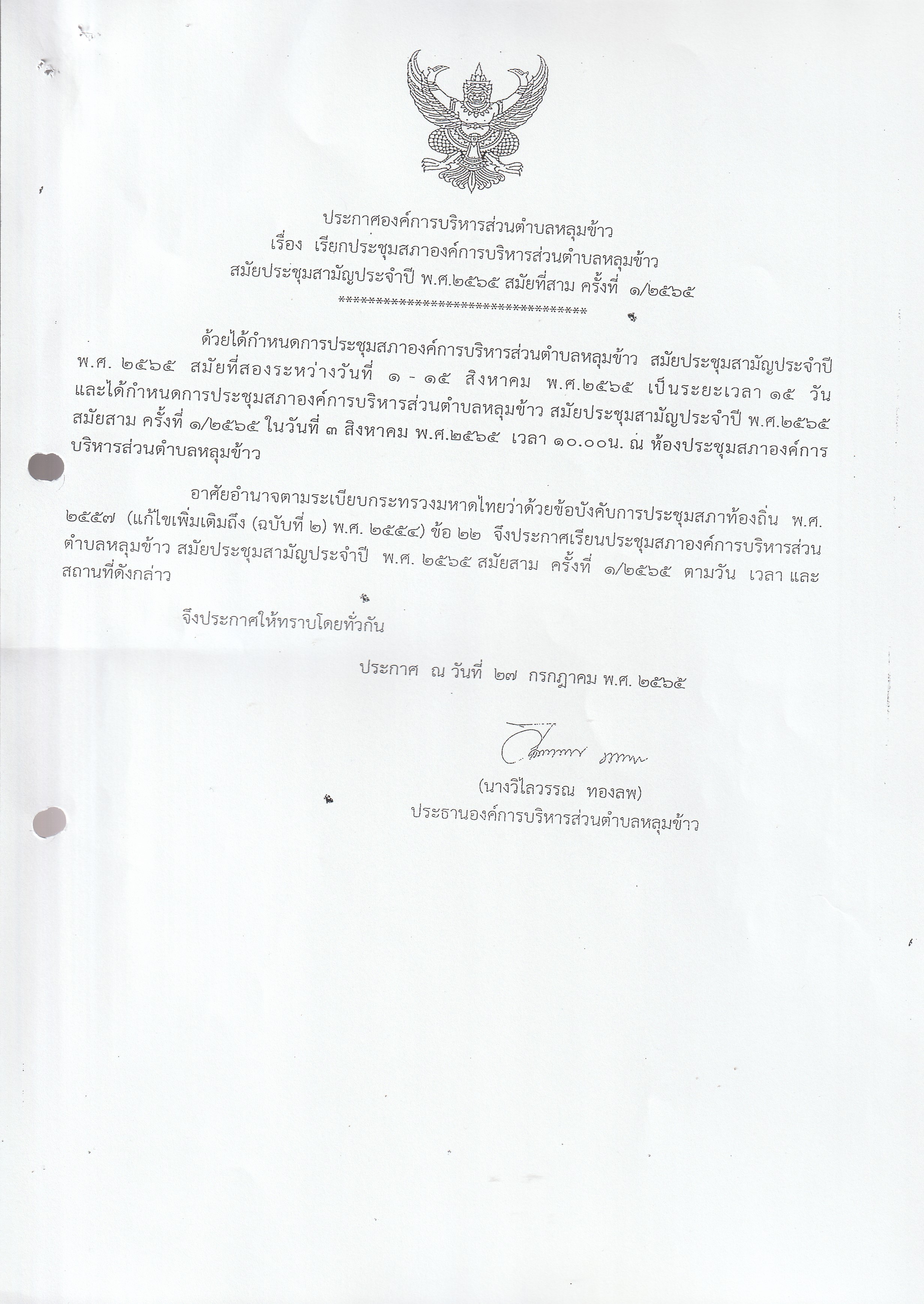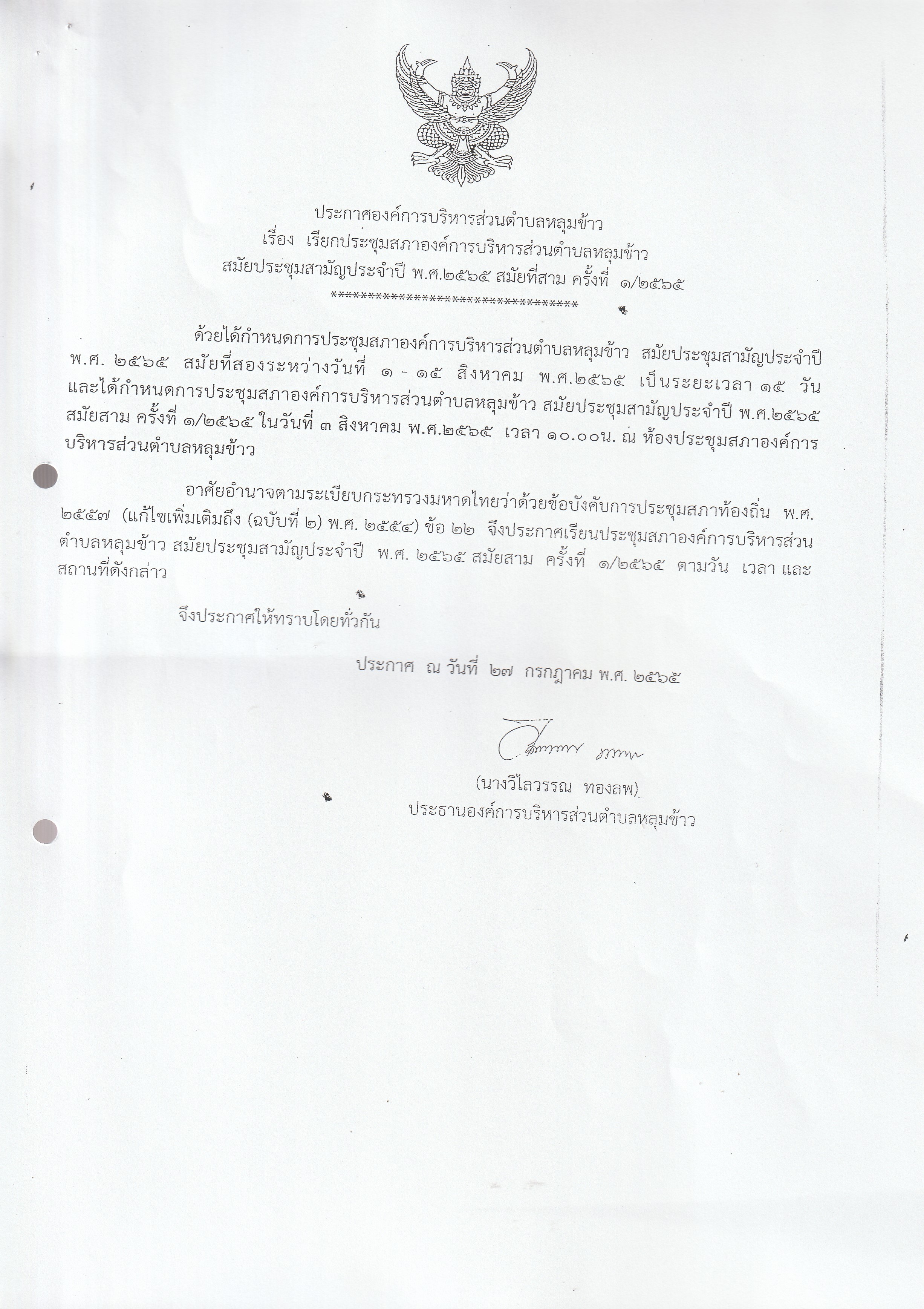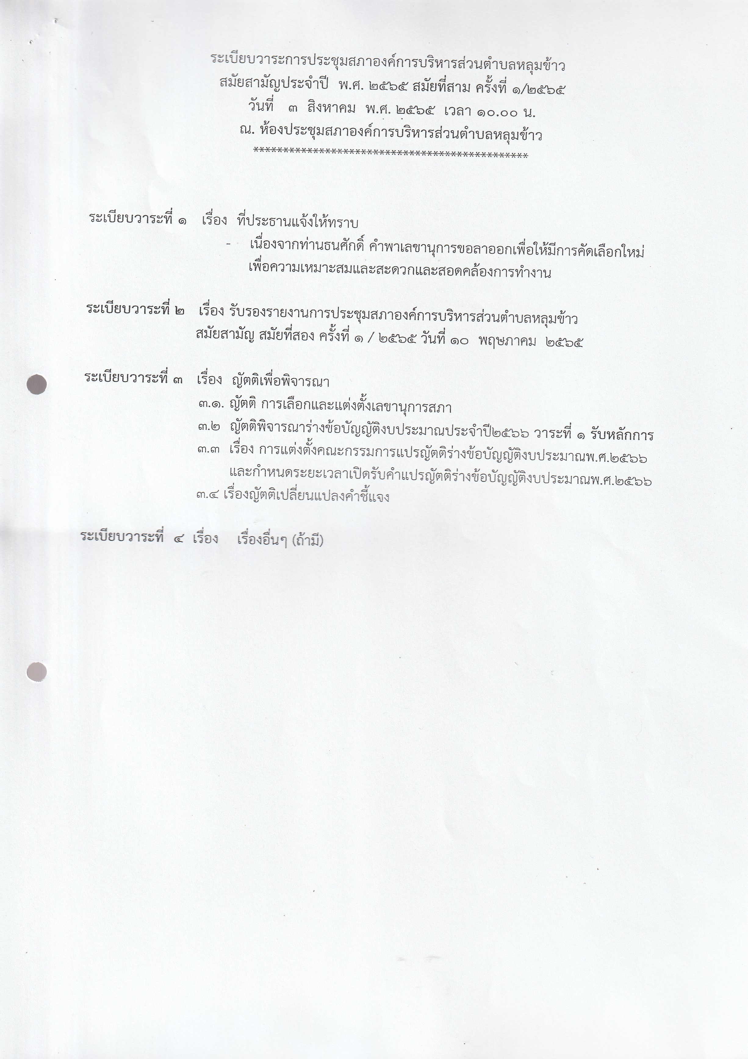 หนังสือเชิญประชุมสภาองค์การบริหารส่วนตำบลหลุมข้าว สมัยที่ 3 ปี 2565 (ครั้งที่ 1)