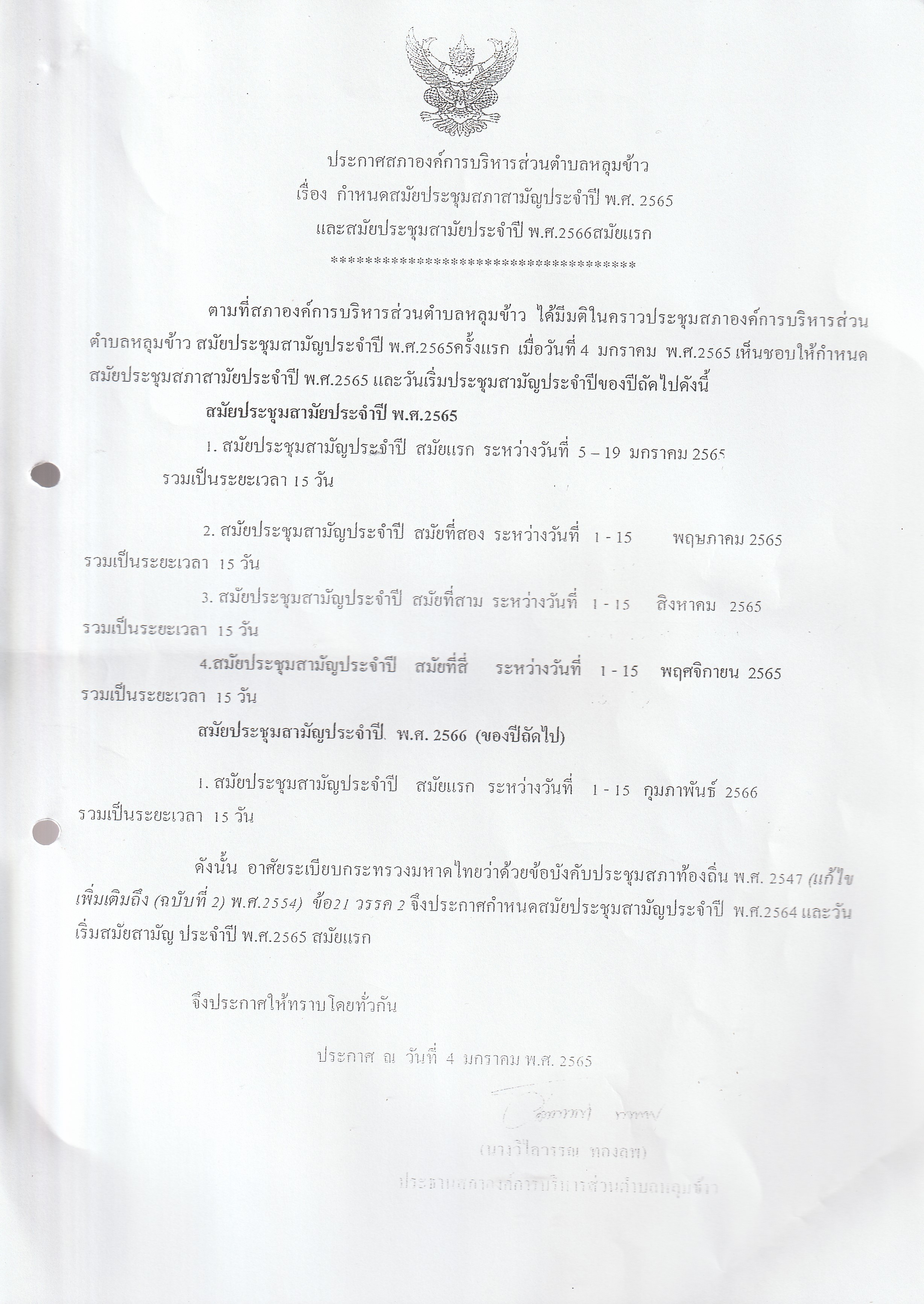 ประกาศ กำหนดสมัยประชุมสภา ประจำปี พ.ศ.2565
