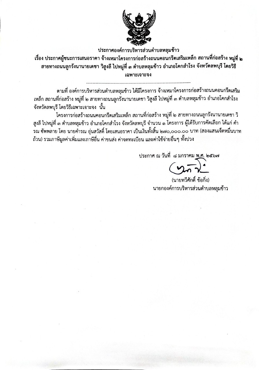 ประการศผู้ชนะชนะการเสนอราคาประจำปีงบประมาณ พ.ศ.2567 จ้างเหมาโครงการก่อสร้างถนนคอนกรีตเสริมเหล็ก สถานที่ก่อสร้าง หมู่ที่ 2 สายทาง ถนนลูกรังนานายเดชา วิ