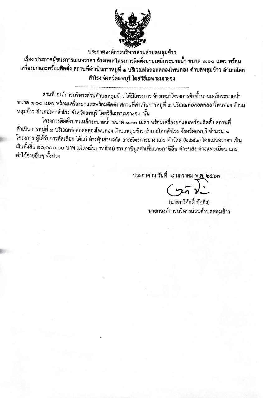 ประการศผู้ชนะชนะการเสนอราคาประจำปีงบประมาณ พ.ศ.2567จ้างเหมาโครงการติดตั้งบานเหล็กระบายน้ำ ขนาด 1.00 เมตร พร้อมยกและพร้อมติดตั้ง สถานที่ดำเนินการ หมู่ท