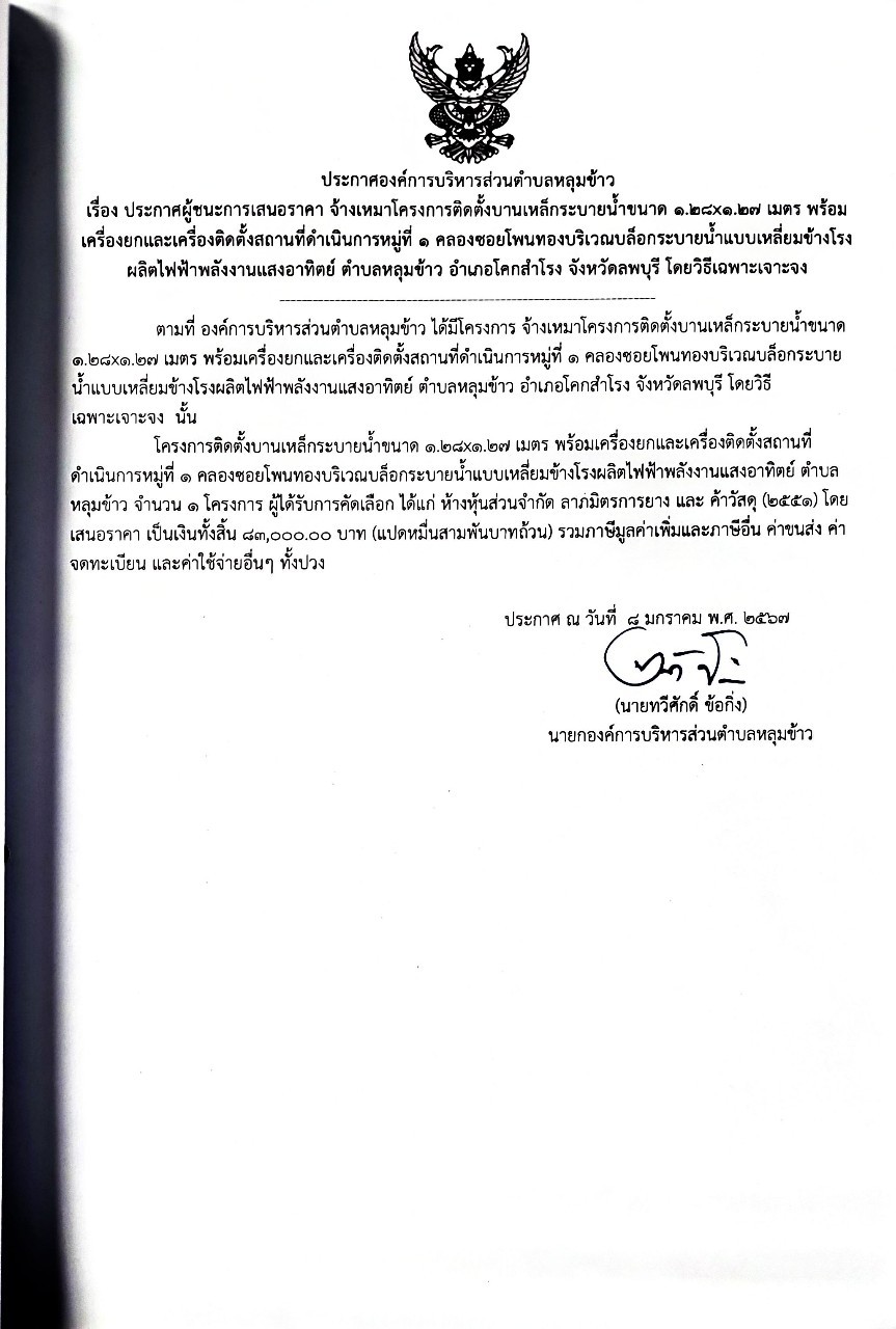 ประการศผู้ชนะชนะการเสนอราคาประจำปีงบประมาณ พ.ศ.2567 จ้างเหมาโครงการติดตั้งบานเหล็กระบายน้ำ ขนาด 1.28x1.27 เมตร พร้อมเครื่องยกและเครื่องติดตั้ง สถานที่
