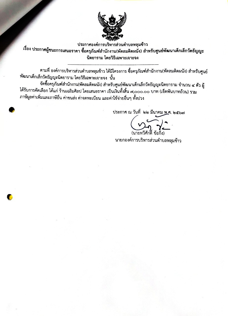 ประการศผู้ชนะชนะการเสนอราคา จัดซื้อครุภัณฑ์สำนักงาน (พัดลมติดผนัง) สำหรับศูนย์พัฒนาเด็กเล็กวัดธัญญะนิตยาราม