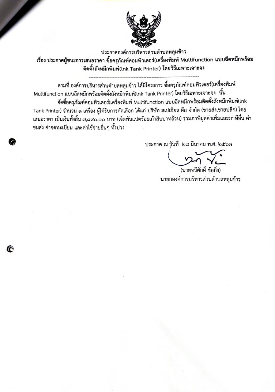 ประการศผู้ชนะชนะการเสนอราคา จัดซื้อครุภัณฑ์คอมพิวเตอร์ (เครื่องพิมพ์ Multifunction แบบฉีดหมึกพร้อมติดตั้งถังหมึกพิมพ์ lnk Tank Printer )