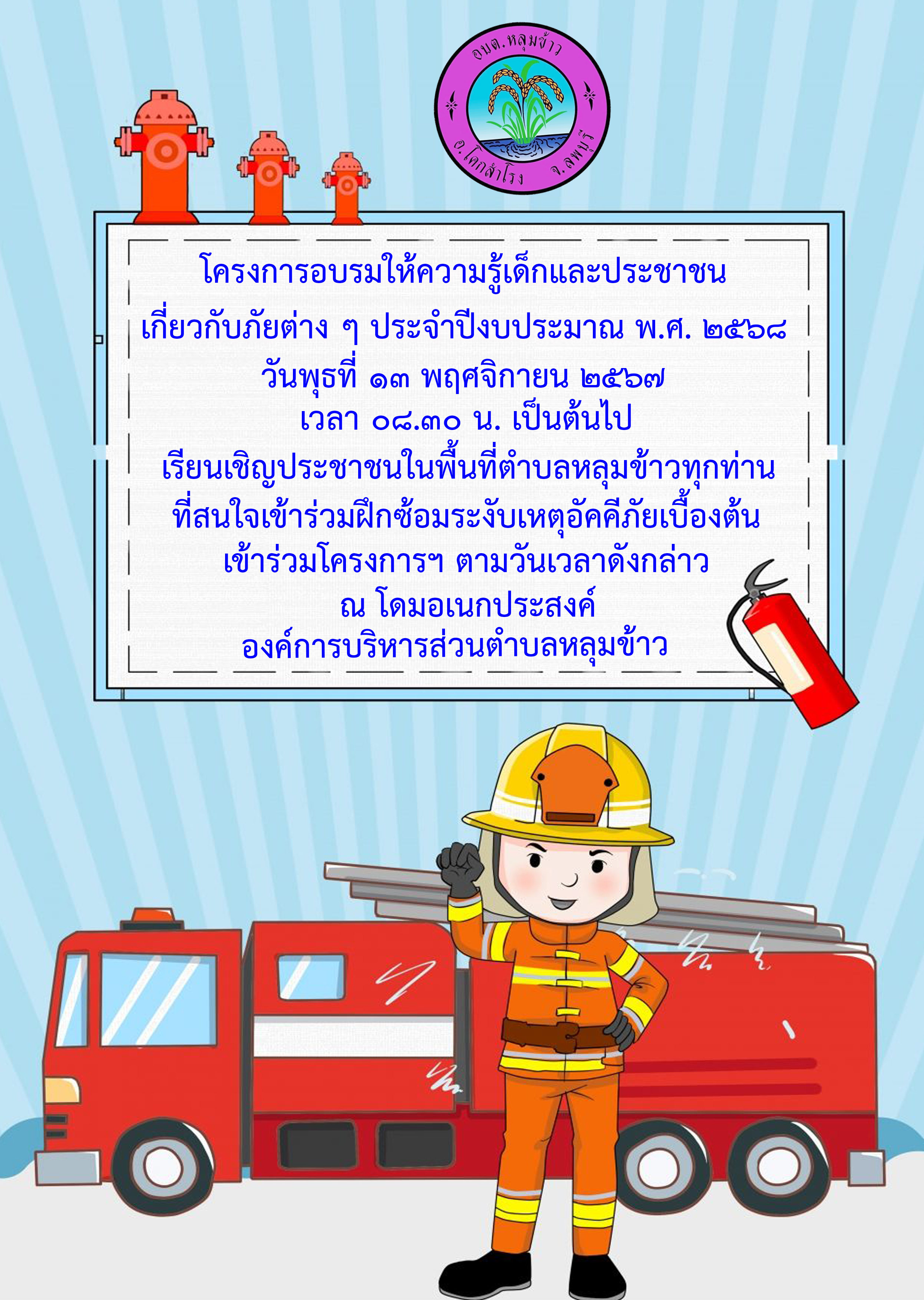 เชิญชวนประชาชนในพื้นที่ตำบลหลุมข้าวเข้าร่วมโครงการอบรมให้ความรู้เด็กและประชาชน เกี่ยวกับภัยต่าง ๆ ประจำปีงบประมาณ พ.ศ. 2568