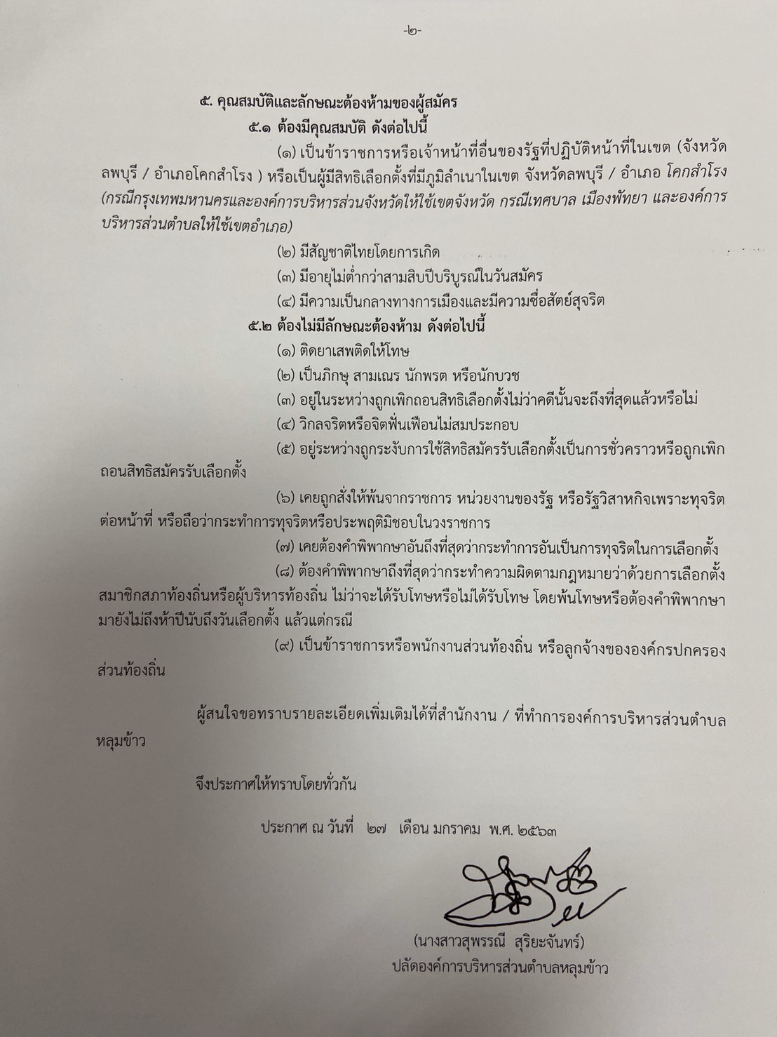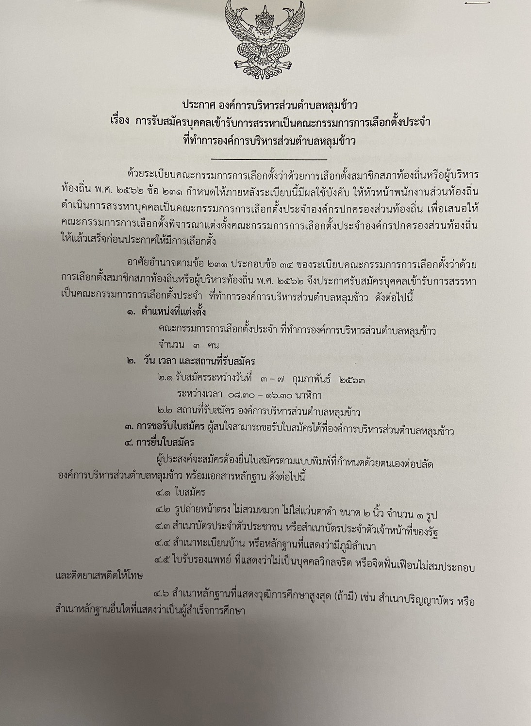 องค์การบริหารส่วนตำบลหลุมข้าว อำเภอโคกสำโรง จังหวัดลพบุรี ประกาศรับสมัครบุคคลเข้ารับการสรรหาเป็นคณะกรรมการเลือกตั้งประจำที่ทำการ อบต.หลุมข้าว